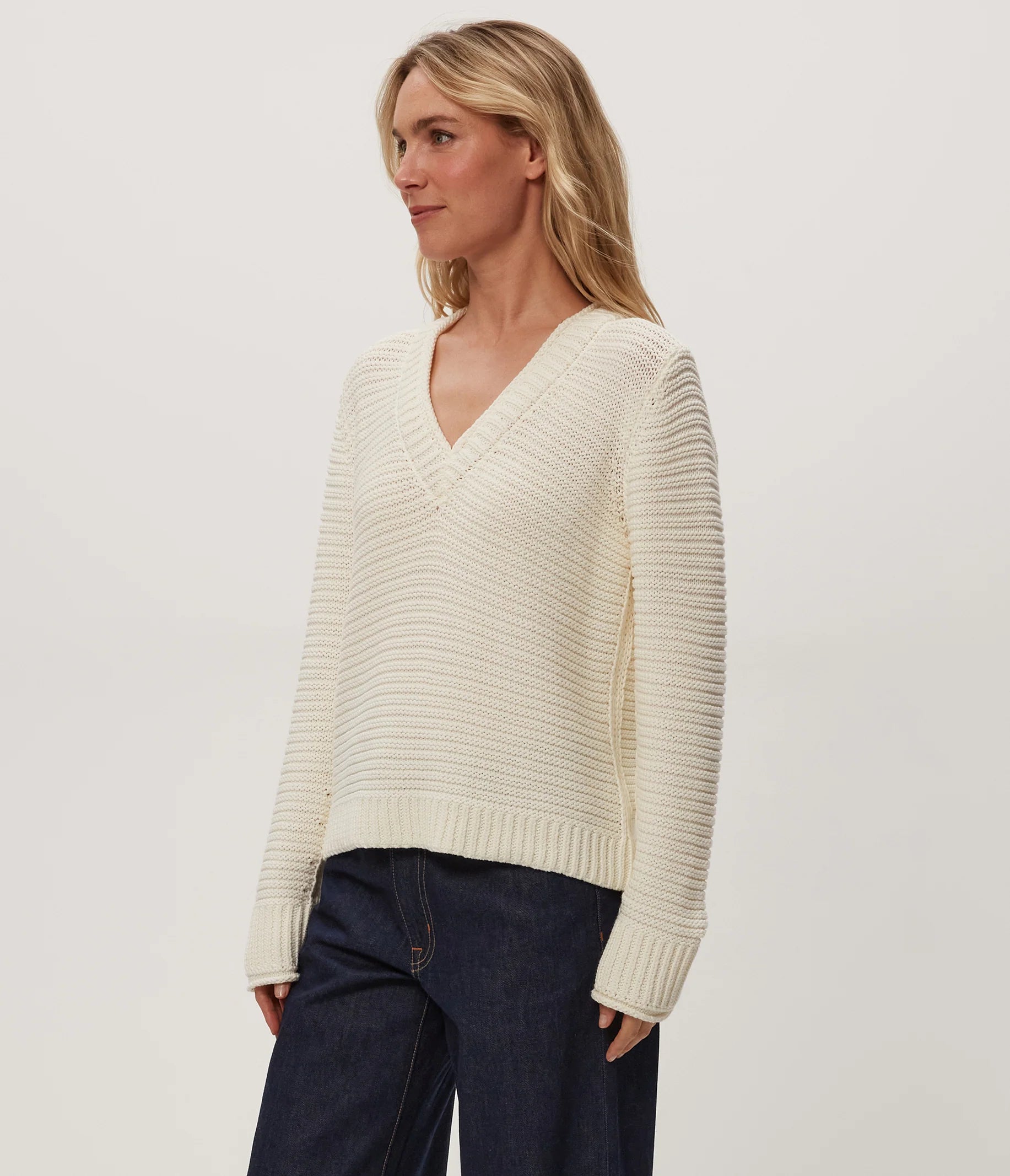 A classic v-neck with an unconventional feel, the Linda is designed from super soft, textured tape yarn. This cool-weather must-have features long sleeves, rib mixing at the neckline and sleeve. This is the easy sweater every wardrobe needs.